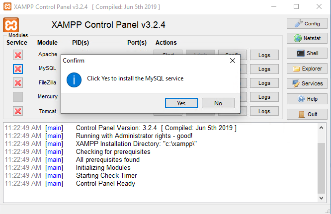 12.(Optional) Install Apache server to automatically start apache on windows startup. Click the red "X" mark beside Apache and click Yes.